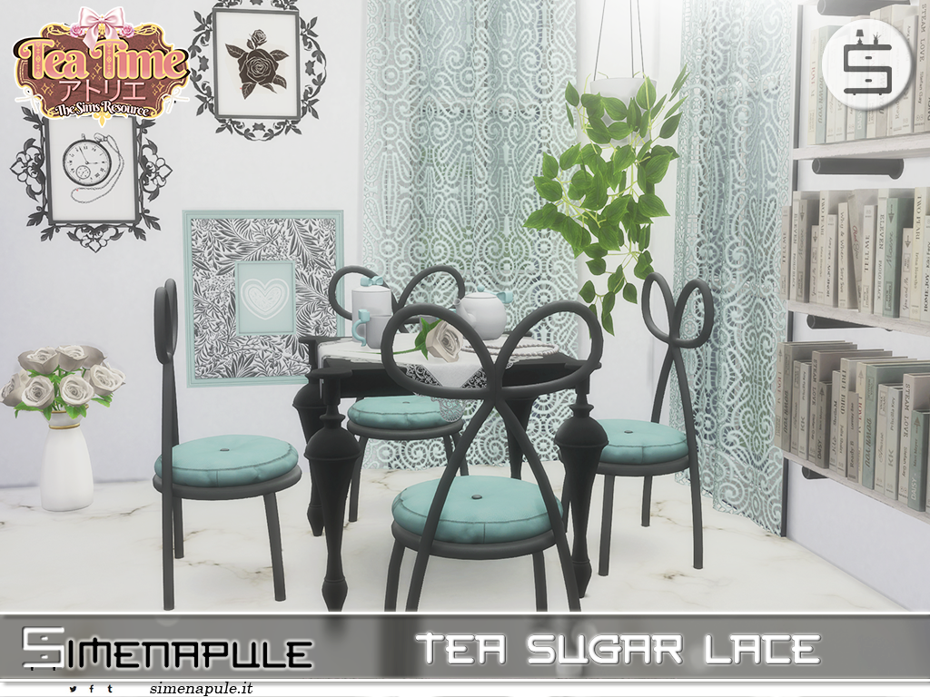 Tea Sugar Lace is an elegant Sims 4 set inspired by the charm of a cozy atelier, featuring a refined tea table, sculpted chairs, lace details, and delicate decor to create a romantic tea corner.