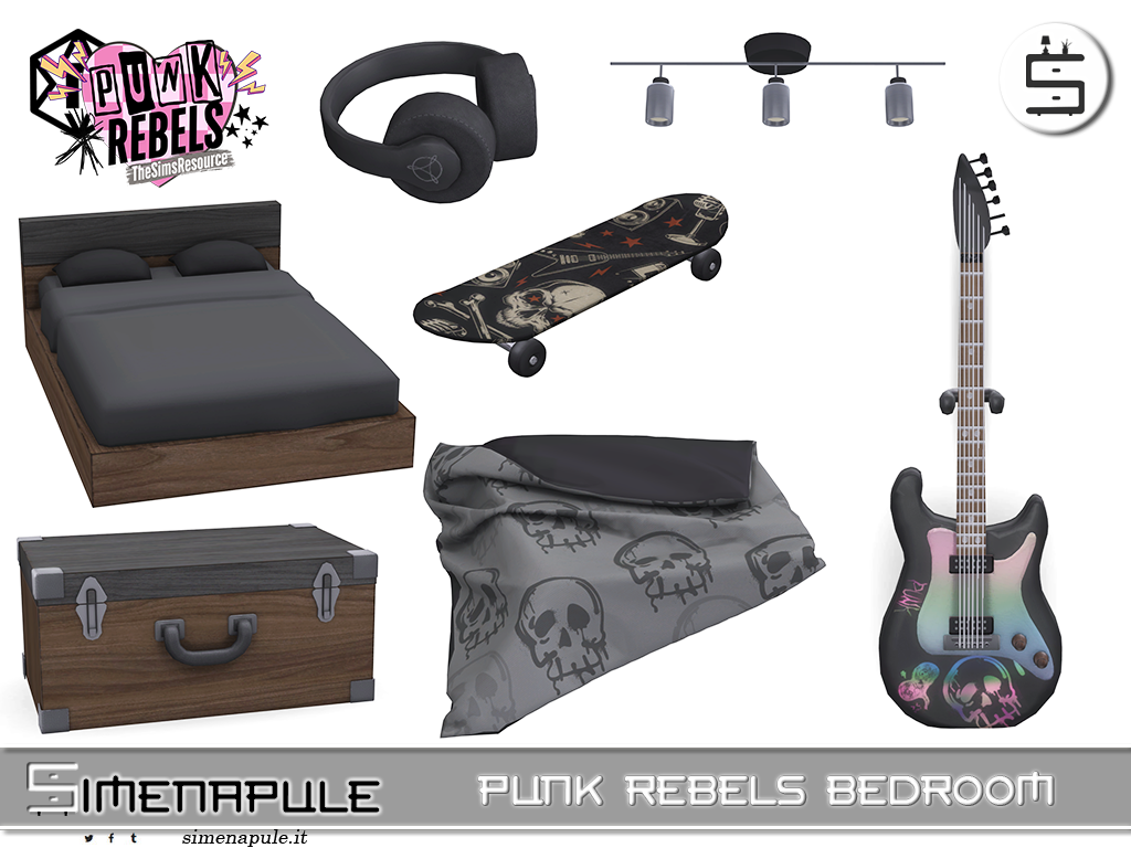 This Punk Rebels bedroom style embraces a bold, rebellious vibe with dark colors, skull motifs, and electric guitars on display.