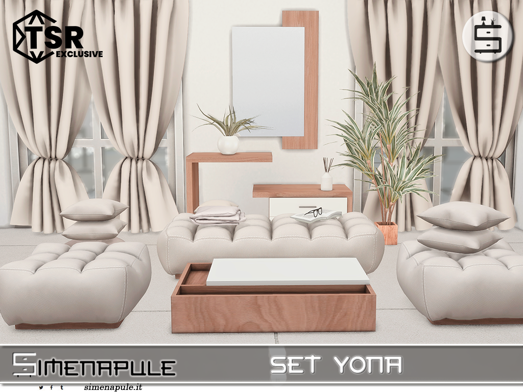 A modern and minimal living room set featuring tufted ottomans, neutral-toned cushions, wood-accented furniture, and soft beige curtains.