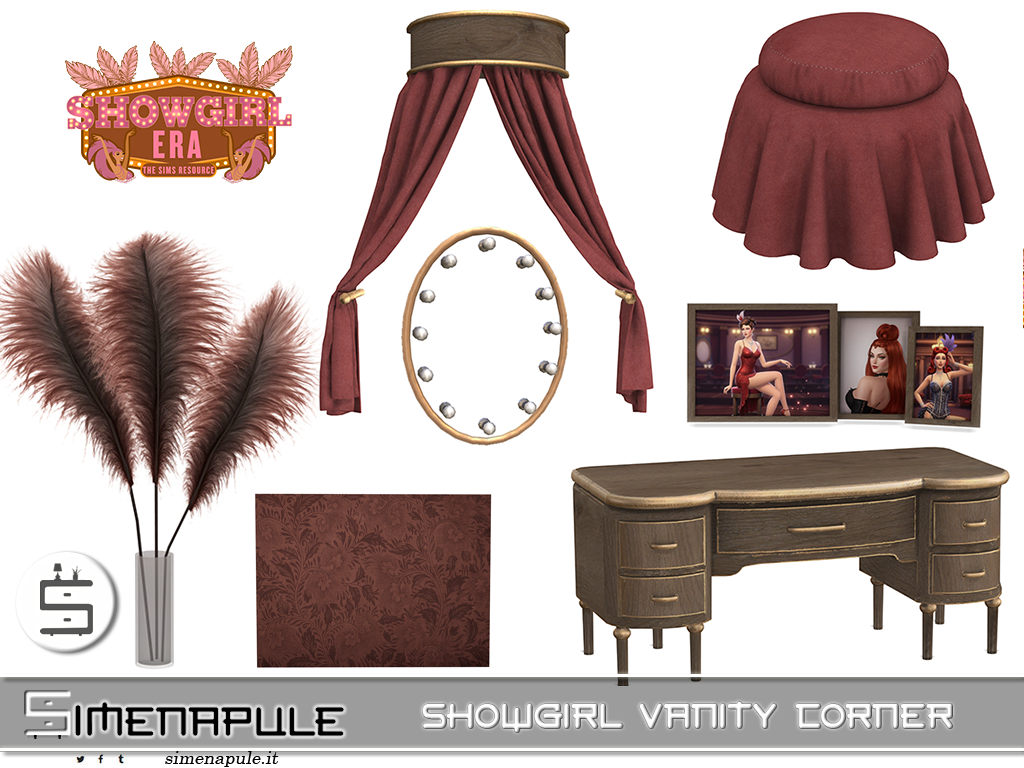 The "Showgirl Era" vanity set captures the golden age of theatrical glamour, bringing vintage burlesque elegance and old Hollywood sophistication to your Sim's boudoir.