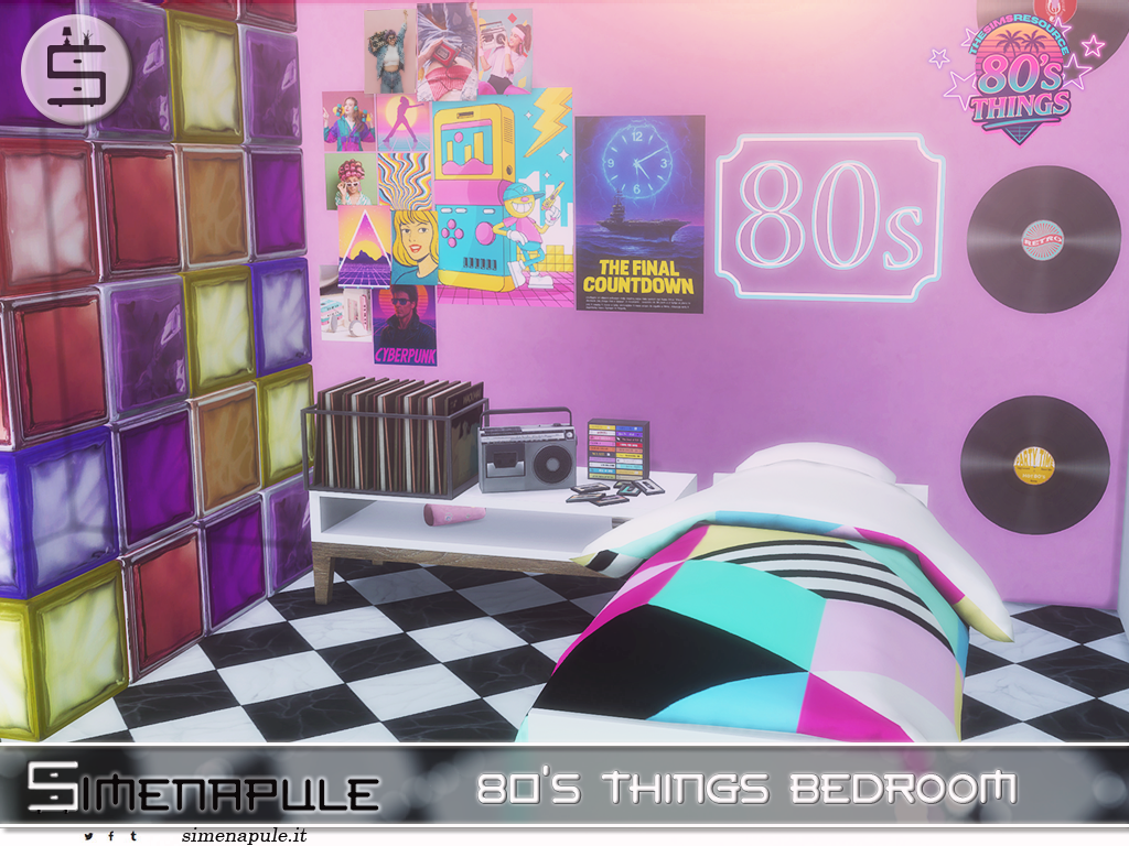 A vibrant 80s-themed bedroom set for The Sims 4, featuring neon signs, retro posters, vinyl records, colorful glass blocks, and bold geometric patterns for a true vintage vibe.