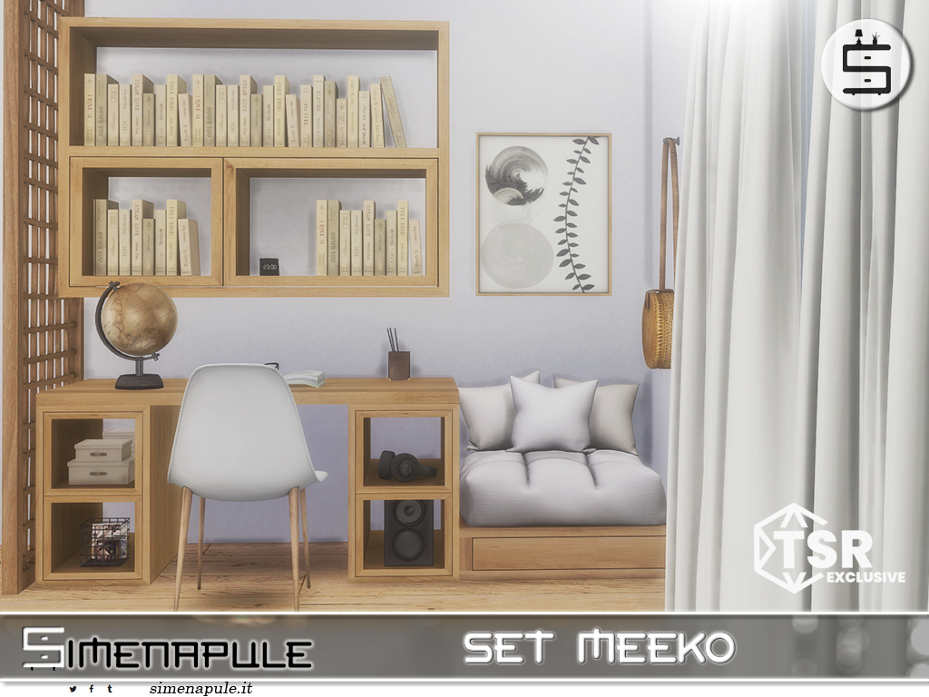 The Meeko Set is a modern, minimalist study and relaxation area featuring a comfortable armchair, functional desk, wall shelving, and elegant decor. Perfect for compact spaces with a warm, contemporary touch.