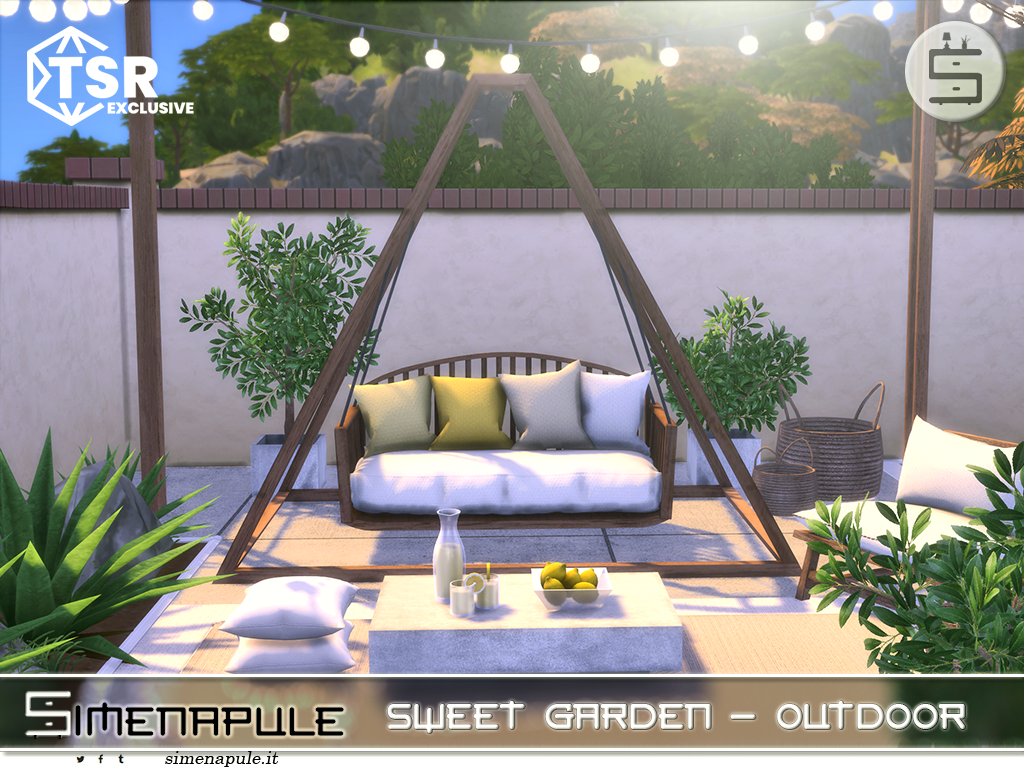 Create a cozy and relaxing outdoor corner with the Sweet Garden set. This collection includes a wooden swing sofa with soft cushions, string lights, a coffee table with lemonade glasses, and two decorative plants.