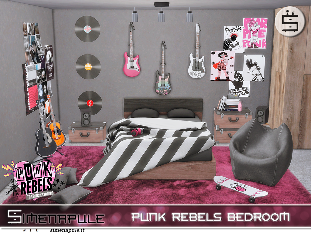 This Punk Rebels bedroom style embraces a bold, rebellious vibe with dark colors, skull motifs, and electric guitars on display.