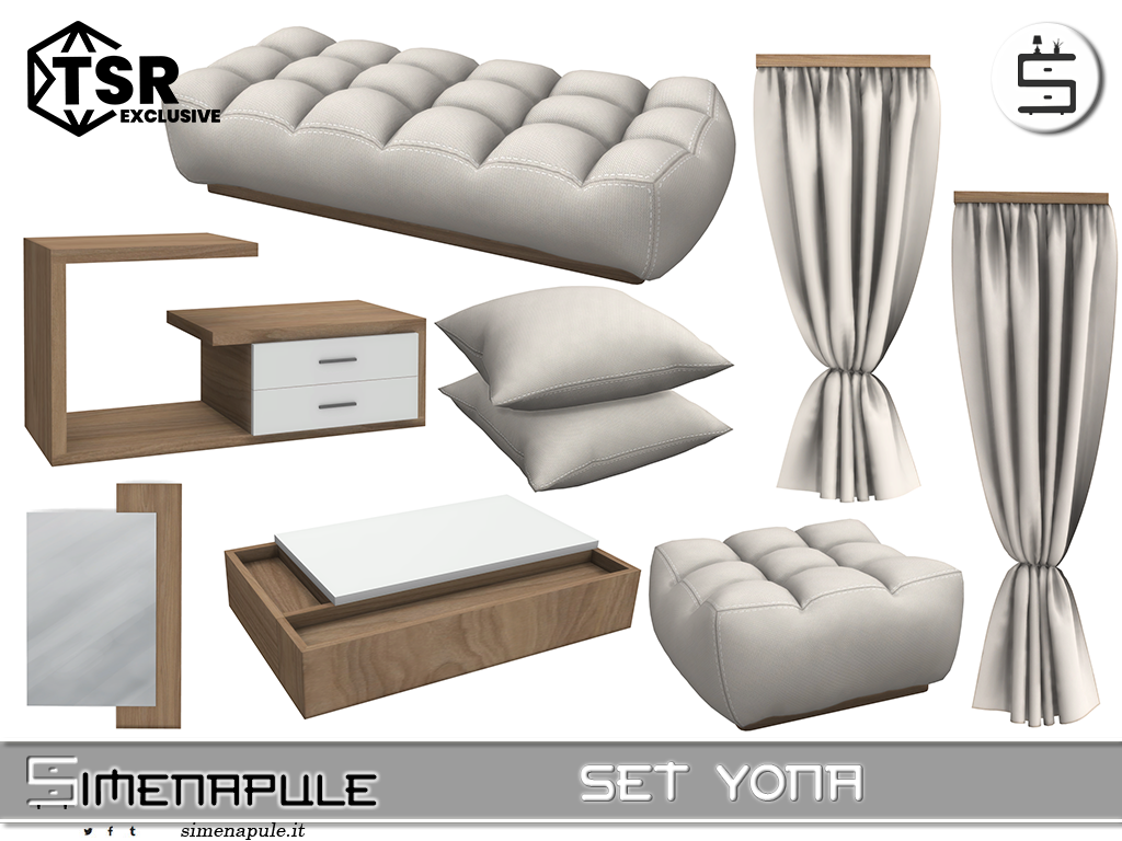 A modern and minimal living room set featuring tufted ottomans, neutral-toned cushions, wood-accented furniture, and soft beige curtains.