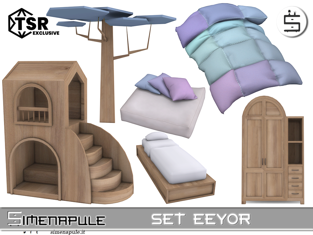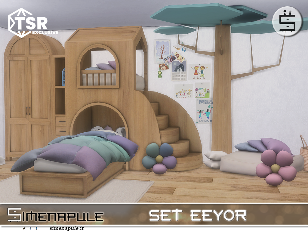 This cozy and whimsical kids' bedroom set features a wooden loft bed with integrated stairs and storage, playful tree and flower-shaped decor, soft pastel bedding.