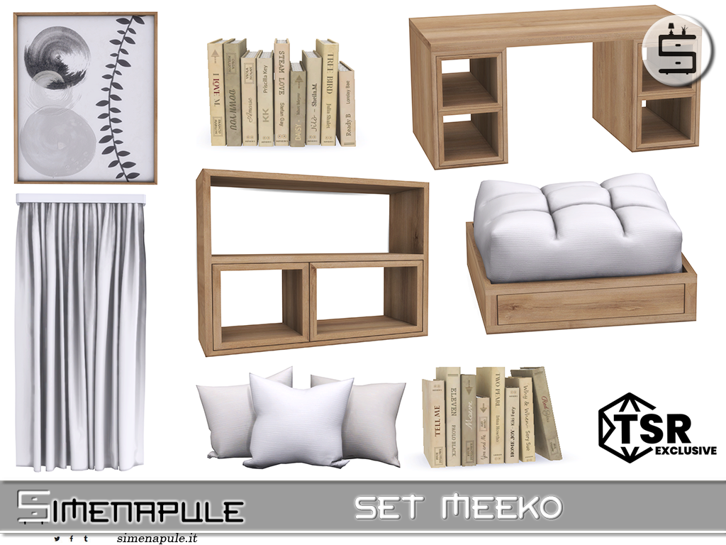 The Meeko Set is a modern, minimalist study and relaxation area featuring a comfortable armchair, functional desk, wall shelving, and elegant decor. Perfect for compact spaces with a warm, contemporary touch.