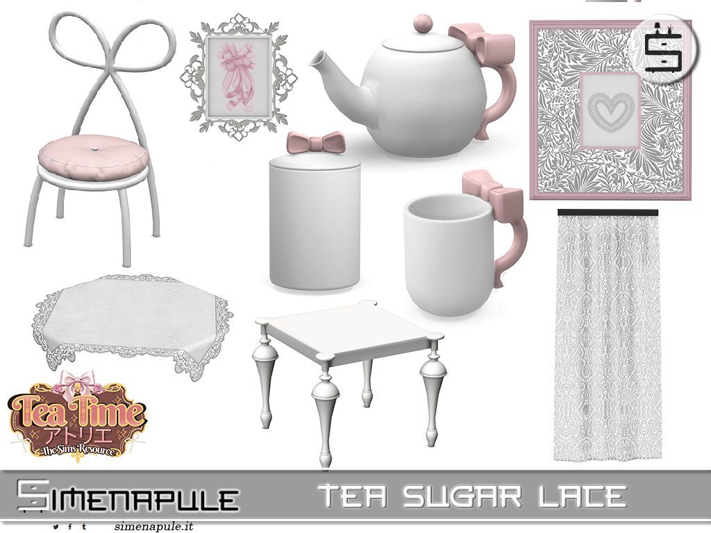 Tea Sugar Lace is an elegant Sims 4 set inspired by the charm of a cozy atelier, featuring a refined tea table, sculpted chairs, lace details, and delicate decor to create a romantic tea corner.